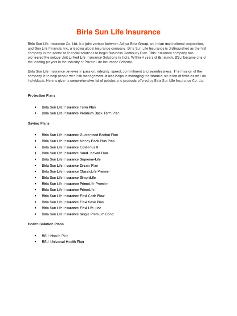 Insurance Plan Insurance Plan Of Birla Sun Life