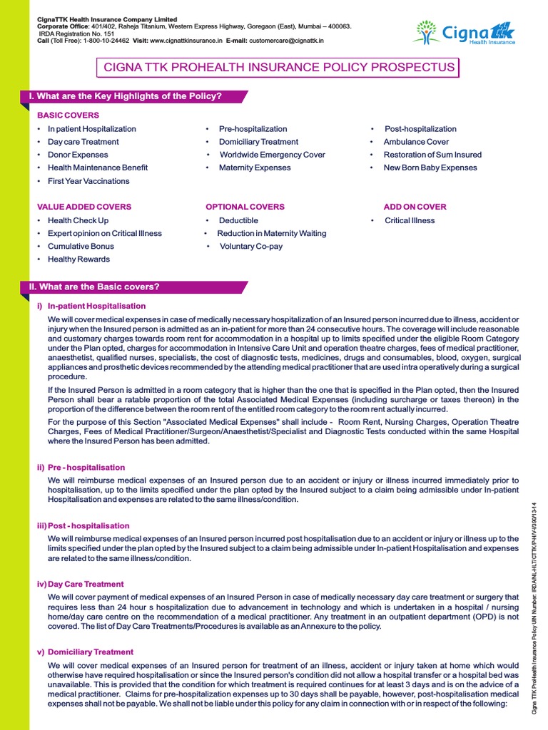 Cigna Ttk Pro Health Insurance Prospectus Insurance Hospital